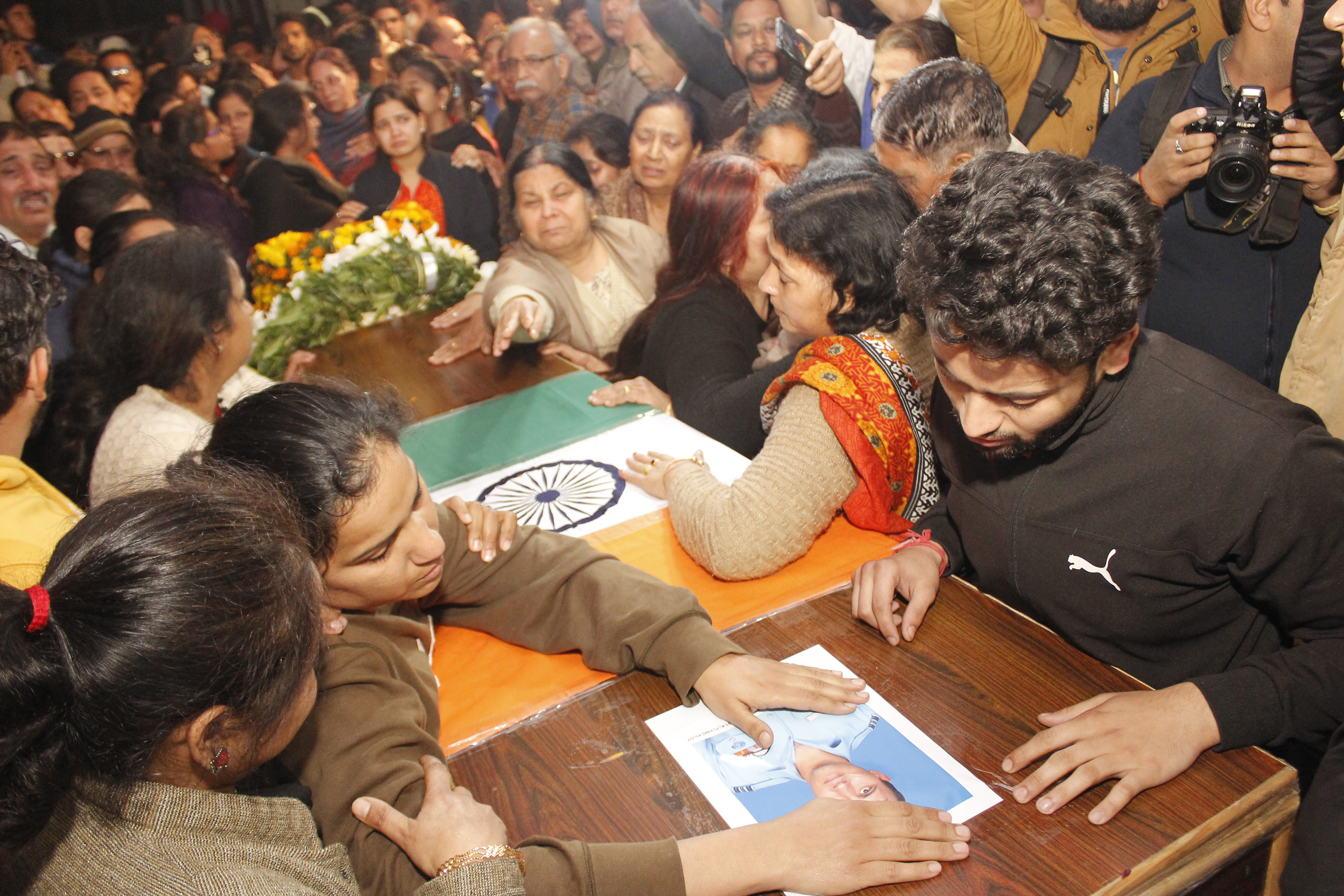 शहीद सिद्धार्थ वशिष्ठ का पाॢथव शरीर उनके निवास स्थान पर शाम करीब 7.55 बजे पहुंचा। यहां पहले से ही बड़ी संख्या में लोग मौजूद थे। जैसे ही एयरफोर्स के कामोडोर शहीद के पाॢथव शरीर को गाड़ी से उतारने लगे तो शहीद सिद्धार्थ की माता सुनीता, बहन प्रीति व उनके रिश्तेदारों की आंखों से आंसू थमने का नाम नहीं ले रहे थे।