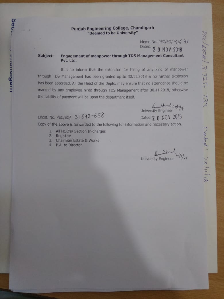वहीं पैक में यूनिवर्सिटी इंजीनियर की ओर से जारी इस पत्र में लिखा गया है कि एक निजी कंपनी मैनेजमैंट की ओर से रखे गए कर्मचारी (मैनपावर) की एक्सटैंशन अब खत्म की जाती है। ये कर्मचारी पैक में दिसम्बर में किसी भी विभाग में अटेंडैंस न लगाएं। क्योंकि इसके बाद इन कर्मचारियों को वेतन नहीं दिया जाएगा।