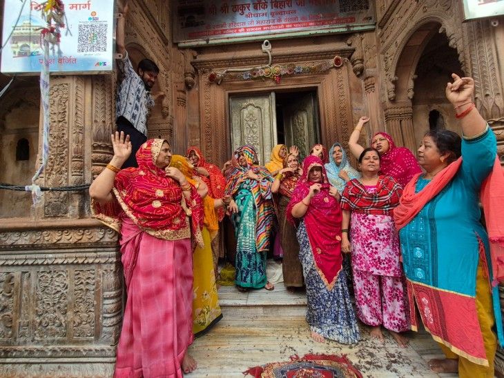 Banke Bihari Mandir : परंपराओं से खिलवाड़ बर्दाश्त नहीं, बांके बिहारी मंदिर गेट पर महिलाओं का प्रदर्शन