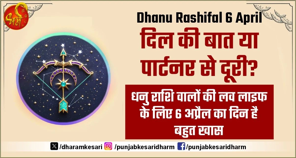 Dhanu Rashifal 6 April : ज्योतिष शास्त्र में धनु राशि को अग्नि तत्व की राशि माना जाता है, जिसका स्वामी बृहस्पति है। धनु राशि के जातक अपनी स्पष्टवादिता, दार्शनिक सोच और स्वतंत्रता प्रिय स्वभाव के लिए जाने जाते हैं। लेकिन जब बात भावनाओं और प्रेम संबंधों की आती है, तो ये अक्सर उलझन में पड़ जाते हैं। 6 अप्रैल 2026 का दिन धनु राशि के जातकों के लिए एक भावनात्मक परीक्षा की घड़ी लेकर आया है। आज का सबसे बड़ा सवाल यह है कि क्या आप अपने 'दिल की बात' कहकर रिश्तों को नई ऊंचाई देंगे, या फिर ईगो और गलतफहमियों के कारण पार्टनर से दूरी बना लेंगे? सितारों की चाल संकेत दे रही है कि आज आपकी लव लाइफ में एक बड़ा मोड़ आने वाला है। तो आइए, विस्तार से समझते हैं आज का आपका भविष्यफल।