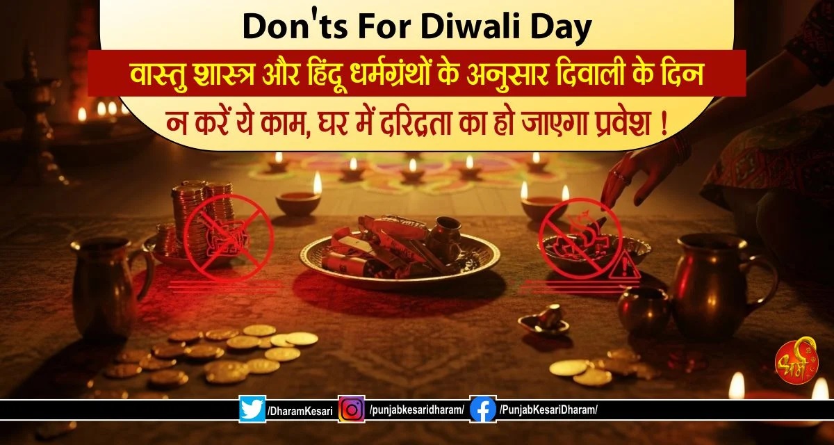 Dont's For Diwali Day:दिवाली केवल रोशनी और खुशियों का पर्व नहीं है, बल्कि यह माता लक्ष्मी के स्वागत और सकारात्मक ऊर्जा को आमंत्रित करने का भी शुभ अवसर है। इस दिन कुछ काम ऐसे हैं जो वास्तु शास्त्र और हिंदू धर्मग्रंथों के अनुसार वर्जित माने गए हैं। इन कार्यों से लक्ष्मी जी की कृपा कम हो सकती है और घर में दरिद्रता का प्रवेश हो सकता है। आइए जानते हैं-
