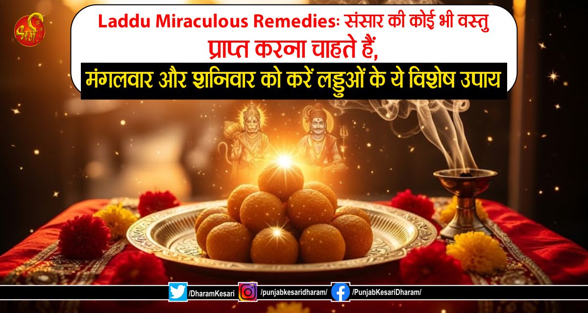 Laddu Miraculous Remedies: मंगलवार और शनिवार को शनिदेव व हनुमान जी की पूजा करने से जीवन में संकटों और बाधाओं का निवारण होता है। शनि दोष, साढ़ेसाती और ढैय्या के कष्ट कम होते हैं तथा धन-समृद्धि की वृद्धि होती है। इन उपायों से भक्त के जीवन में सुख, सौभाग्य और सुरक्षा का वातावरण बनता है। संसार की कोई भी वस्तु प्राप्त करना चाहते हैं तो मंगलवार और शनिवार को करें लड्डुओं के ये विशेष उपाय-