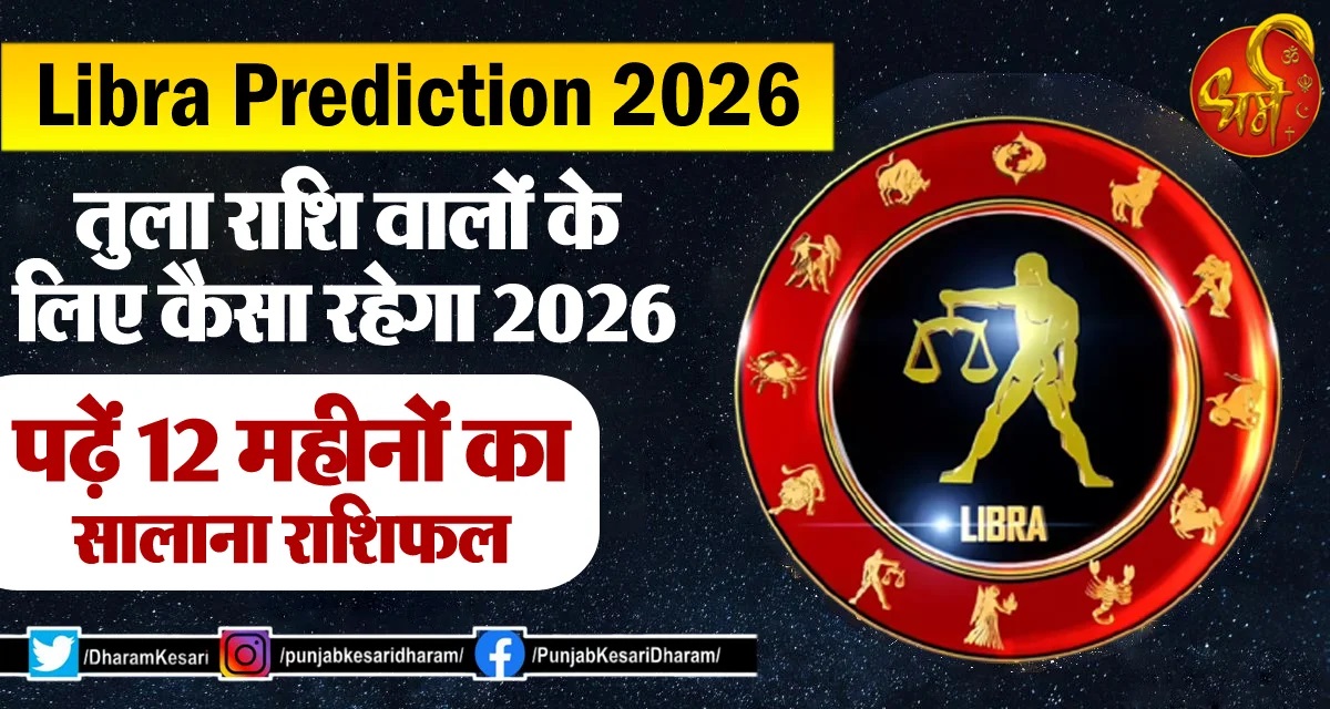 Libra Prediction 2026: तुला राशिफल 2026 विशेष रूप से तुला राशि के जातकों के लिए तैयार किया गया है, जिसके माध्यम से आप जान सकेंगे कि वर्ष 2026 तुला राशि वालों के लिए कैसा रहेगा। आपको जीवन के विभिन्न क्षेत्रों में कैसे परिणाम मिलेंगे? नए साल में आपकी सेहत कैसी रहेगी? शिक्षा में मिलेगी सफलता या समस्याएं आएंगी बार-बार? व्यापार में होगा लाभ या करना होगा इंतज़ार? प्रेम और वैवाहिक जीवन में मिलेगा साथी का साथ? इन सभी सवालों के जवाब आपको तुला राशिफल 2026 में प्राप्त होंगे। इसके अलावा, साल 2026 में होने वाले ग्रहों के गोचर के आधार पर आपको उपाय भी प्रदान किए जाएंगे। तो चलिए अब हम आगे बढ़ते हैं और जान लेते हैं तुला राशि वालों का संपूर्ण भविष्यफल।