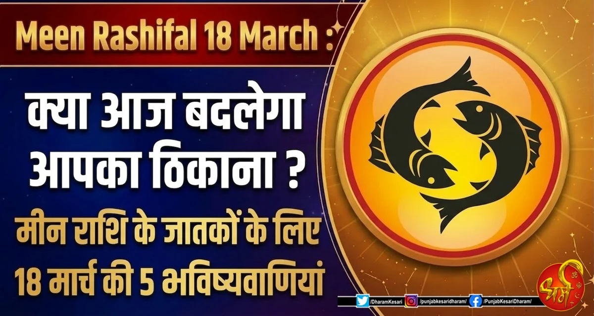 Meen Rashifal 18 March : 18 मार्च, 2026 का दिन मीन राशि के जातकों के लिए अत्यधिक भावुक, आध्यात्मिक और कुछ बड़े भौतिक बदलावों का संकेत दे रहा है। आपकी राशि के स्वामी बृहस्पति और वर्तमान ग्रह गोचर की स्थिति यह बता रही है कि आज आपके जीवन में परिवर्तन की एक लहर चलने वाली है। मीन राशि के लोग स्वभाव से स्वप्नद्रष्टा और संवेदनशील होते हैं, और आज आपके वे सपने हकीकत का रूप ले सकते हैं जो स्थान परिवर्तन या नई शुरुआत से जुड़े थे। क्या आज आपकी सुख-सुविधाओं में वृद्धि होगी ? क्या आपको अपना पुराना ठिकाना छोड़कर नई जगह जाना पड़ेगा ? आइए विस्तार से जानते हैं आज की 5 बड़ी भविष्यवाणियां।