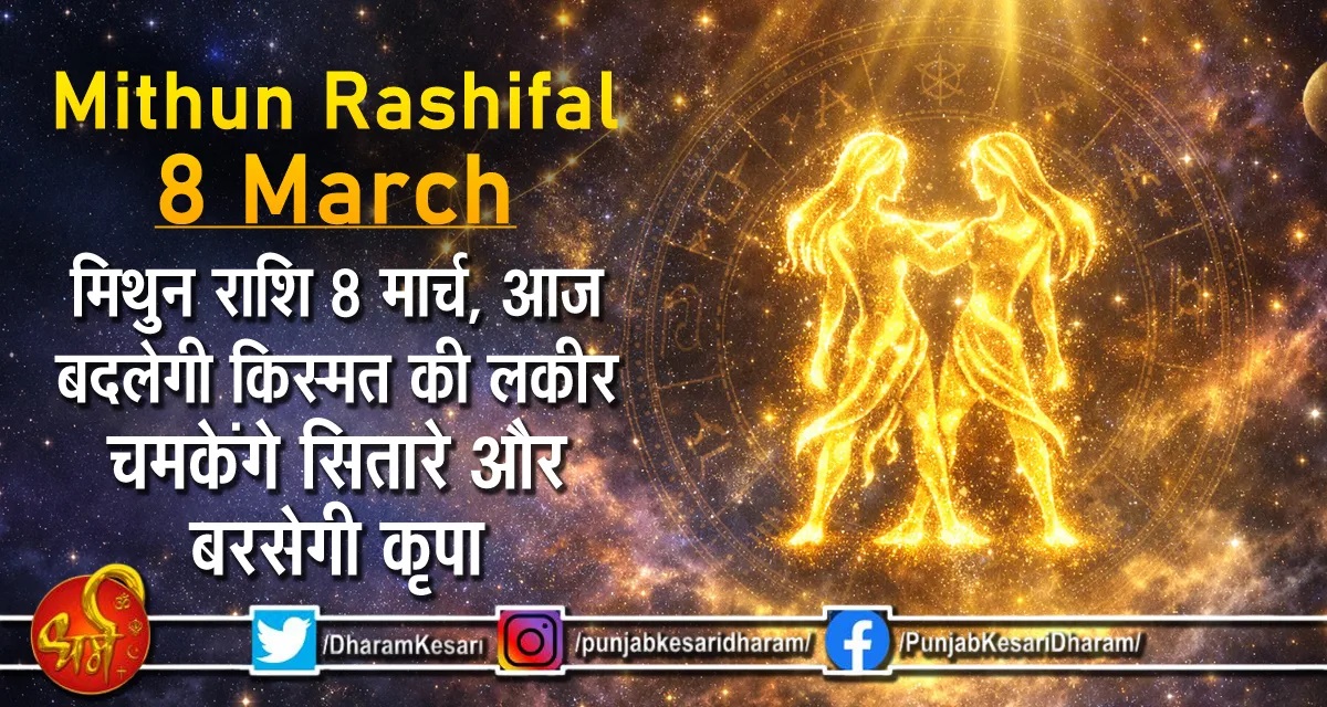 Mithun Rashifal 8 March : मिथुन राशि के जातकों के लिए 8 मार्च 2026 का दिन किसी वरदान से कम नहीं रहने वाला है। बुध के स्वामित्व वाली यह राशि अपनी वाकपटुता, बुद्धिमानी और मिलनसार स्वभाव के लिए जानी जाती है। आज ग्रहों का गोचर संकेत दे रहा है कि आपकी राशि के लिए भाग्य के द्वार खुलने वाले हैं। इस साल 8 मार्च का दिन इसलिए भी ऐतिहासिक है क्योंकि अंतरराष्ट्रीय महिला दिवस के साथ-साथ आपकी कुंडली में गजकेसरी योग और बुधादित्य योग का शुभ प्रभाव देखने को मिल रहा है। आइए विस्तार से जानते हैं कि करियर, धन, प्यार और स्वास्थ्य के मामले में आज आपकी किस्मत की लकीरें क्या कह रही हैं।