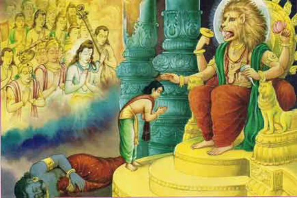 ऐसा वरदान पाकर हिरण्यकशिपु स्वयं को अमर मान कर अधिक अहंकार में आ गया और स्वयं को भगवान कहने लगा। दैत्य हिरण्यकशिपु के घर प्रह्लाद का जन्म हुआ। वह बालक भगवान विष्णु के प्रति भक्ति भाव रखता था जो हिरण्यकशिपु को बिल्कुल पसंद नहीं था। उसने अनेकों बार पुत्र को समझाया कि वह भगवान विष्णु की नहीं बल्कि उसकी पूजा करे। उसने प्रह्लाद को बहुत समझाया परंतु जब वह न माना तो उसने प्रह्लाद को मारने के अनेक असफल प्रयास और अंतत: अंतिम प्रयास के रूप में जब प्रह्लाद के वध का प्रयास किया तो भक्त प्रह्लाद ने नारायण को पुकारा जिस पर ब्रह्मा जी के दिए हुए वचन को पूरा करने के लिए भगवान विष्णु खम्बे में से नृसिंह अवतार लेकर प्रकट हो गए। वह हिरण्यकशिपु को उठा कर घर की दहलीज पर ले आए। उन्होंने उसे अपनी गोद में लिटा लिया तथा शेर मुख तथा पंजों के नाखूनों से चीर कर उसे मार दिया। उसे दिए वचन को पूरा करते हुए भगवान ने कहा कि ‘इस समय न दिन है न रात अर्थात संध्या का समय है, न मैं नर हूं न पशु, अर्थात आधा शरीर पशु तथा आधा मनुष्य का है’ तभी उनका नाम नृसिंह पड़ा।