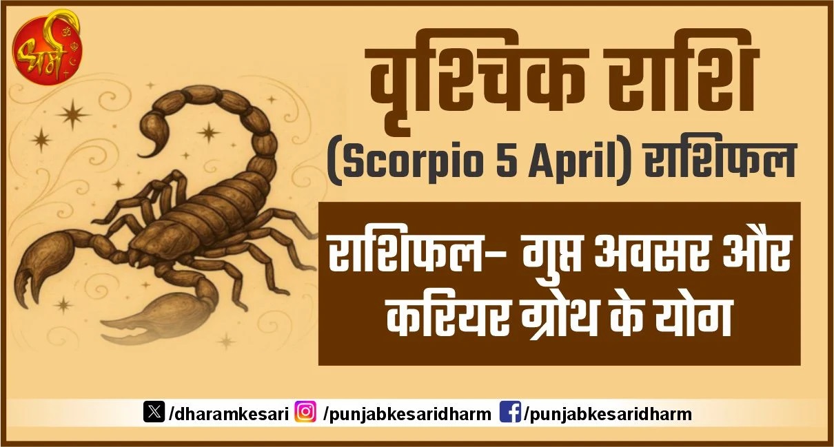 Vrishchika Rashifal 5 April 2026 आज का वृश्चिक राशिफल 5 अप्रैल 2026: 5 अप्रैल का दिन वृश्चिक राशि वालों के लिए रहस्यमय अवसरों, आंतरिक शक्ति और करियर में आगे बढ़ने के संकेत लेकर आया है। यह राशि स्वभाव से ही गहराई, रणनीति और दृढ़ संकल्प का प्रतीक होती है और आज ये सभी गुण आपके लिए सफलता का मार्ग खोल सकते हैं।