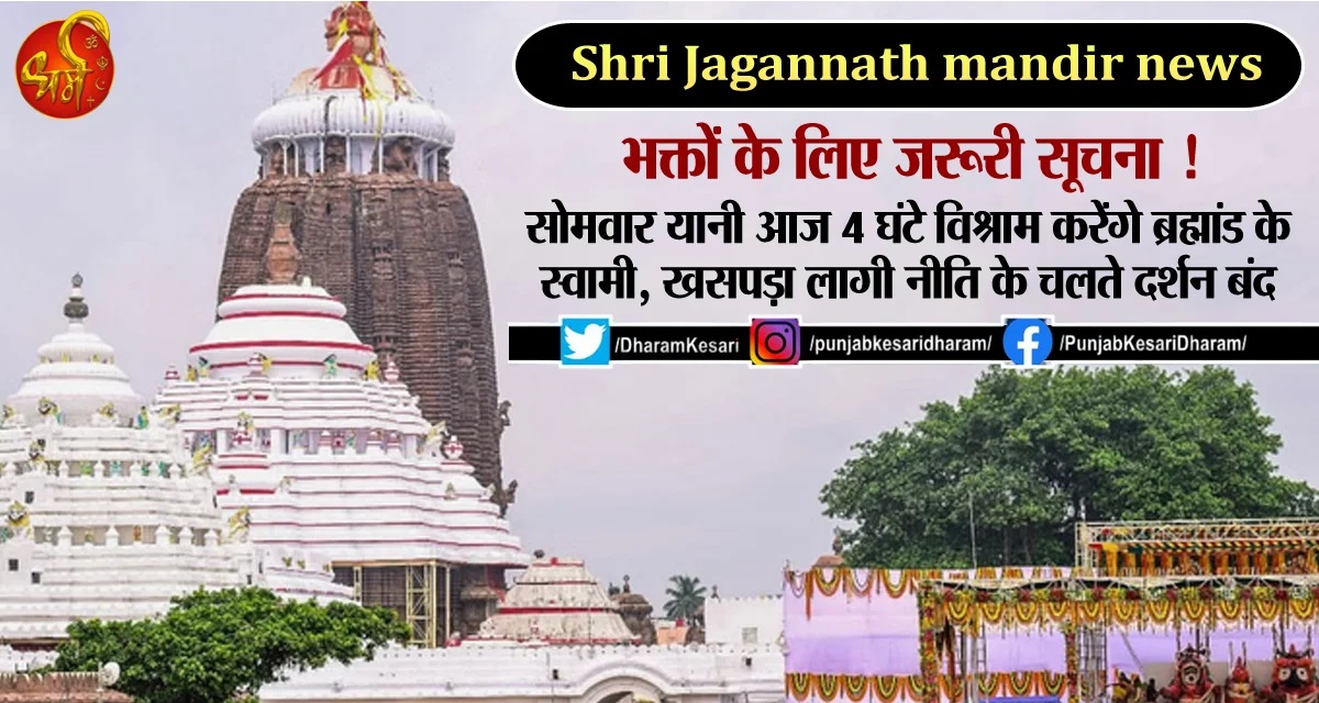 Shri Jagannath mandir news : भक्तों के लिए जरूरी सूचना ! सोमवार यानी आज 4 घंटे विश्राम करेंगे ब्रह्मांड के स्वामी, खसपड़ा लागी नीति के चलते दर्शन बंद