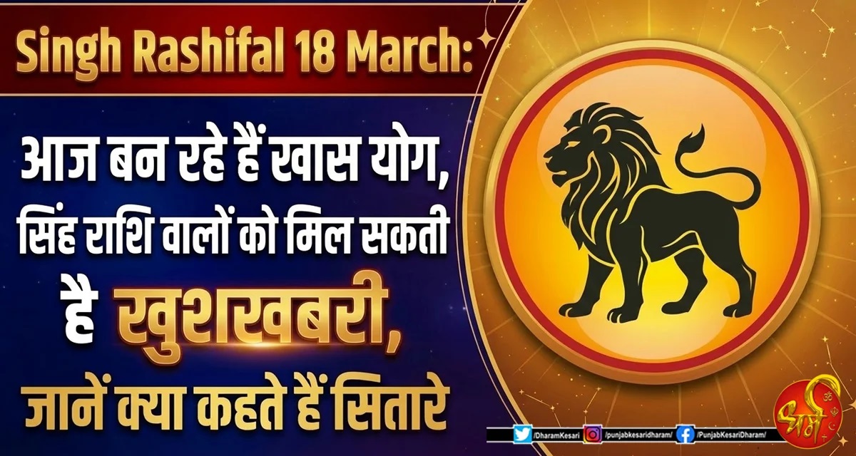 Singh Rashifal 18 March : 18 मार्च, 2026 का दिन सिंह राशि के जातकों के लिए किसी वरदान से कम नहीं रहने वाला है। ग्रहों की गणना बता रही है कि आज आपकी राशि में गजकेसरी या शुभ कर्तरी जैसे कुछ विशेष ज्योतिषीय योग बन रहे हैं, जो आपके मान-सम्मान और पद-प्रतिष्ठा में वृद्धि करेंगे। सिंह राशि का स्वामी 'सूर्य' है, जो सफलता और तेज का प्रतीक है। आज सितारों की चाल यह संकेत दे रही है कि पिछले काफी समय से आप जिस खुशखबरी का इंतजार कर रहे थे, वह आज आपके द्वार पर दस्तक दे सकती है। आइए विस्तार से जानते हैं कि आज आपका भाग्य किन क्षेत्रों में चमकने वाला है।