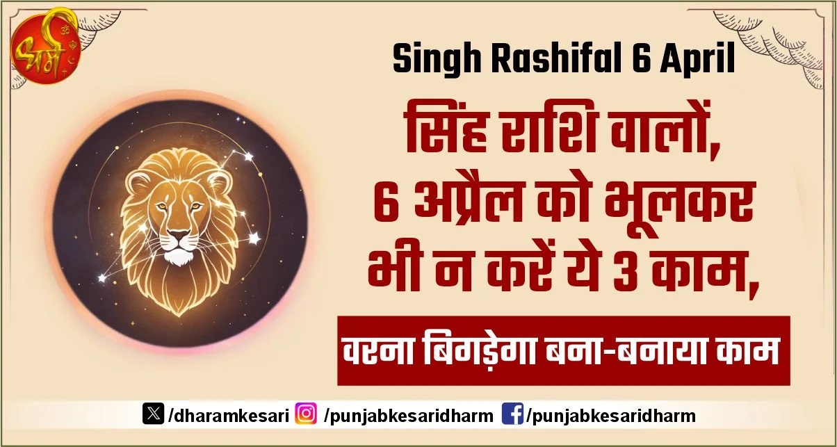 Singh Rashifal 6 April : सिंह राशि वालों, 6 अप्रैल को भूलकर भी न करें ये 3 काम, वरना बिगड़ेगा बना-बनाया काम