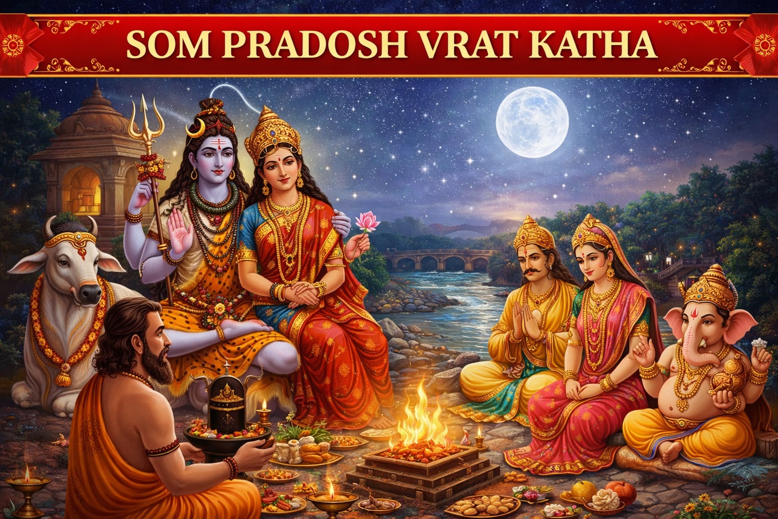 Som Pradosh Vrat Katha : हिंदू धर्म में प्रदोष व्रत को महादेव की कृपा प्राप्त करने का सबसे सरल और प्रभावशाली मार्ग माना गया है। जब यह व्रत सोमवार के दिन पड़ता है, तो इसका महत्व कई गुना बढ़ जाता है, क्योंकि सोमवार स्वयं भगवान शिव का प्रिय दिन है। मान्यता है कि सोम प्रदोष के दिन सूर्यास्त के समय, जिसे प्रदोष काल कहा जाता है, भोलेनाथ अत्यंत प्रसन्न मुद्रा में रहते हैं और अपने भक्तों के बड़े से बड़े कष्टों का निवारण कर देते हैं। यदि आपके जीवन में आर्थिक तंगी है, मानसिक अशांति रहती है या बनते हुए काम बिगड़ रहे हैं, तो सोम प्रदोष का व्रत और इसकी पौराणिक कथा का श्रवण आपकी सोई हुई किस्मत को जगाने की शक्ति रखता है। यह कथा न केवल हमें धैर्य और अटूट श्रद्धा की सीख देती है, बल्कि यह भी बताती है कि कैसे महादेव की भक्ति एक दरिद्र को भी वैभवशाली बना सकती है। तो आइए, जानते हैं कि क्यों यह व्रत कथा हर शिव भक्त के लिए वरदान माना जाता है।