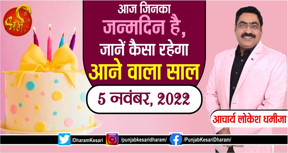 Today's Birthday Prediction: आज आपके जन्मदिन की आपको बहुत-बहुत शुभकामनाएं। 5 नवम्बर में जन्में व्यक्तियों का मूलांक 5 होता है, जिनके स्वामी बुध देव हैं। मूलांक 5 वाले जातक बहुत चतुर और बुद्धिमान होते हैं। ये लोग अक्सर अपने जीवन में हर परिस्थिति का सामना अपनी बुद्धि-कौशल के बल पर ही करते हैं। इन लोगों में अद्भुत वाकपटुता देखने को मिलती है। ये लोग अपने शब्दों से दूसरों का मन मोह लेते हैं। मूलांक 5 वाले जातक अद्भुत शब्दों के चयन के साथ अपने पक्ष को दूसरे के सामने रखते हैं। जिससे कि वह इनकी बात से सहमति रखें और अपने इस परिश्रम में ये लोग अक्सर कामयाब भी होते हैं। मूलांक 5 वाले जातकों की शिक्षा भी अच्छी रहती है। ये लोग प्रायः विभिन्न विषयों में रूचि रखते हैं। ये लोग पढ़ाई के साथ-साथ रचना और कला के क्षेत्र में भी अच्छे होते हैं। अक्सर मूलांक 5 वाले जातक विविध क्षेत्रों का ज्ञान रखते हैं परन्तु बहुत बार अपनी इस आदत के कारण किसी एक क्षेत्र में निपुणता पाने में चूक जाते हैं। मूलांक 5 वाले जातक बहुत ही हंसमुख और चंचल होते हैं। ये लोग ज्यादा देर उदास नहीं रह सकते। मूलांक 5 वाले जातक बहुत जल्दी दूसरों को अपना मित्र बना लेते हैं। इन लोगों का वैवाहिक जीवन भी अक्सर सुखमय होता है।
