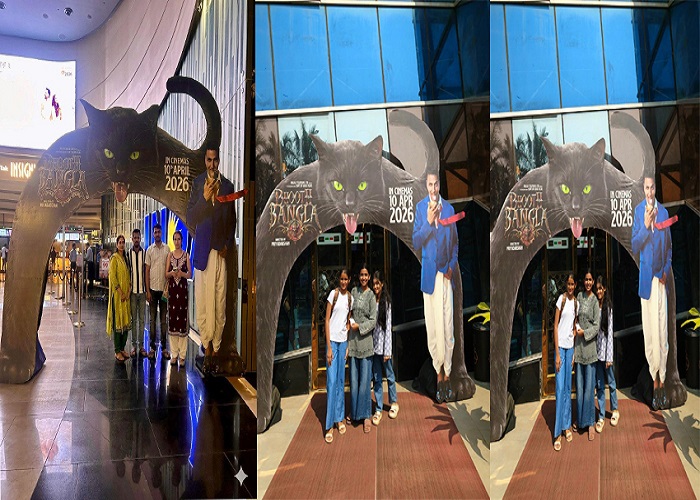 नई दिल्ली/टीम डिजिटल। बालाजी मोशन पिक्चर्स की आने वाली फिल्म ‘भूत बंगला’ का टीज़र जैसे ही थिएटर में दिखाया गया, दर्शकों के बीच जबरदस्त उत्साह देखने को मिला। Akshay Kumar की इस फिल्म को लेकर पहले से ही काफी बज बना हुआ है, और अब टीज़र ने उस एक्साइटमेंट को और बढ़ा दिया है। थिएटर में एंट्री करते ही दर्शक फिल्म के पोस्टर्स और सेटअप के साथ सेल्फी लेते नजर आए। खासकर बच्चे और परिवार इस हॉरर-कॉमेडी के अनोखे अनुभव को काफी एंजॉय कर रहे हैं।