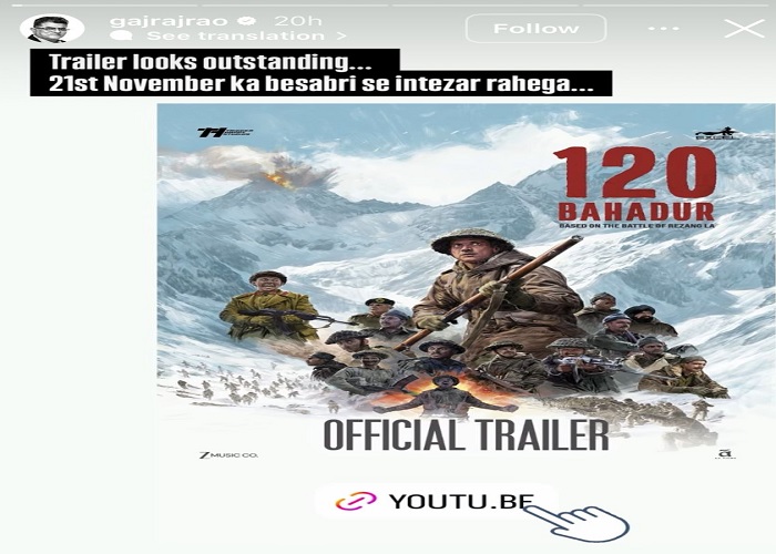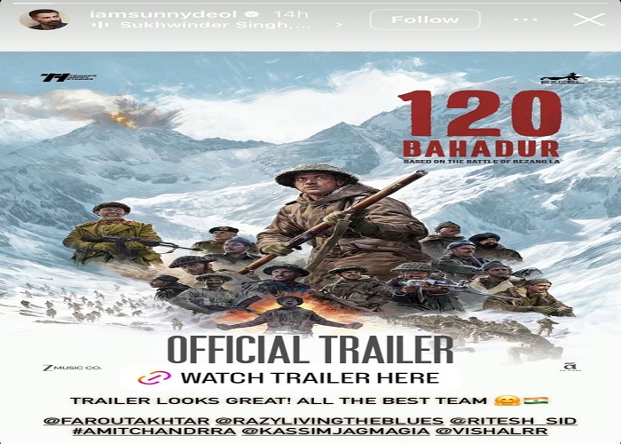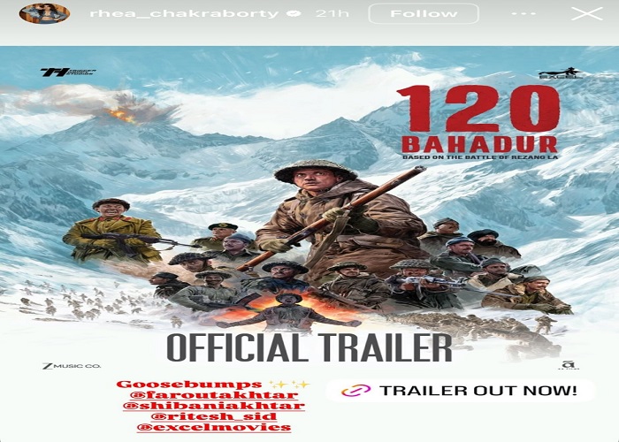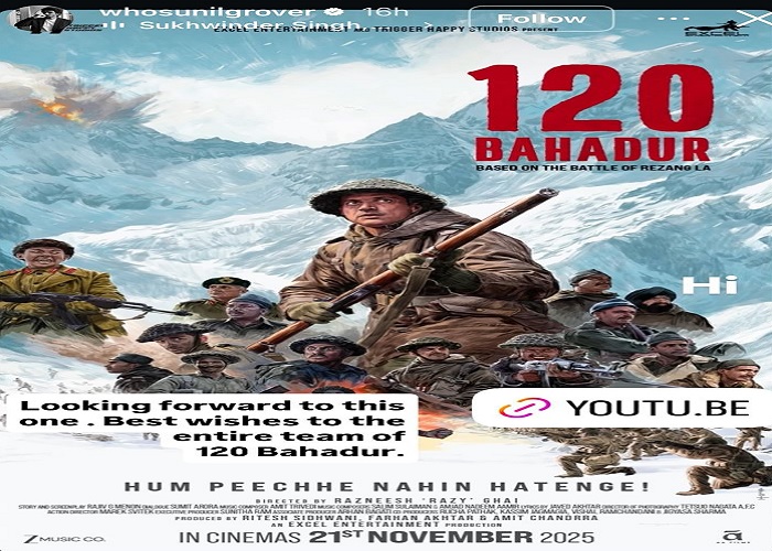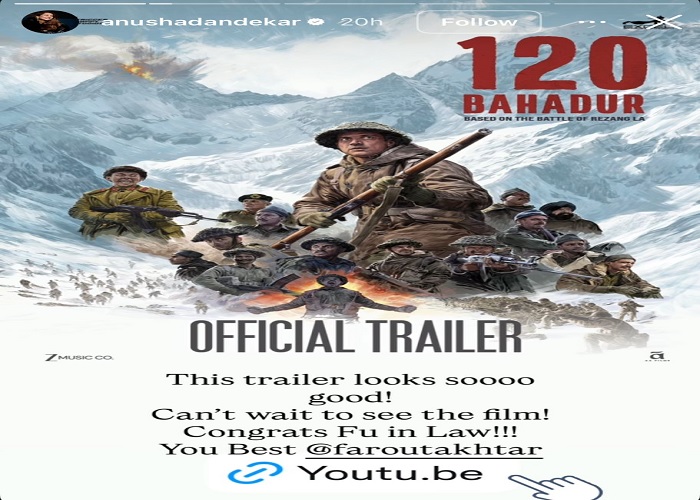 नई दिल्ली/टीम डिजिटल। बहुत ही इंतज़ार के बाद 120 बहादुर का ट्रेलर आखिरकार रिलीज हो गया है, और पहले ही फ्रेम से यह अपनी बड़े स्केल, जोश और इमोशंस के साथ दर्शकों को पकड़ लेता है। यह भारत के सबसे बहादुर सैनिकों की बहादुरी को एक शक्तिशाली श्रद्धांजलि है। बेहतरीन ट्रांज़िशन, जोरदार बैकग्राउंड स्कोर और ऐसे इमोशंस जो लंबे समय तक बने रहते हैं। कहना गलत नहीं होगा कि यह सिर्फ एक ट्रेलर नहीं, बल्कि एक ऐसा अनुभव है जो खत्म होने के बाद भी आपके साथ रहता है। जहाँ ट्रेलर पूरे देश से खूब तारीफें बटोर रहा है, वहीं अब सेलिब्रिटीज़ ने भी सोशल मीडिया पर अपनी तारीफों की बौछार कर दी है और इंटरनेट पर हलचल मचा दी है।