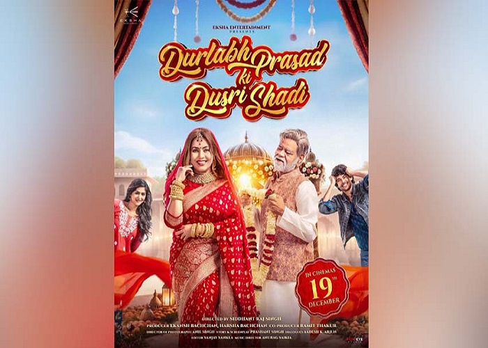 नई दिल्ली/टीम डिजिटल। कुछ समय पहले संजय मिश्रा और महिमा चौधरी का दूल्हा-दुल्हन वाले लुक में एक वीडियो वायरल हुआ था,अब उनकी आने वाली फ़िल्म दुर्लभ प्रसाद की दूसरी शादी का नया रिलीज डेट पोस्टर सामने आया है, जिसमे महीमा चौधरी लाल ब्राइडल लहंगे में दमकती हुई दिखाई देती हैं, जबकि संजय मिश्रा हाथ में वरमाला लिए शरारती अंदाज़ में उन्हें देखते हुए दिखाई देते हैं। पोस्टर में व्योम यादव और पलक लालवानी भी नज़र आते हैं, और बैकड्रॉप में बारात की चहल-पहल इसे पूरे शादी-सीज़न वाला परफेक्ट माहौल देती है। 19 दिसंबर 2025 को सिनेमाघरों में रिलीज़ होने जा रही इस रोमांटिक कॉमेडी के पोस्टर में संजय मिश्रा और महीमा चौधरी खूबसूरत शादी के जोड़े में नज़र आ रहे हैं।