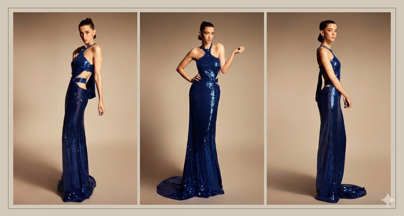 गाउन में कमर के पास कट-आउट विवरण दिया गया है, जो सबा की टोन्ड बॉडी को खूबसूरती से फ्लॉन्ट कर रहा है। साथ ही, किनारों पर लगे शीयर पैनल इस लुक में आधुनिकता और बोल्डनेस का तड़का लगा रहे हैं।