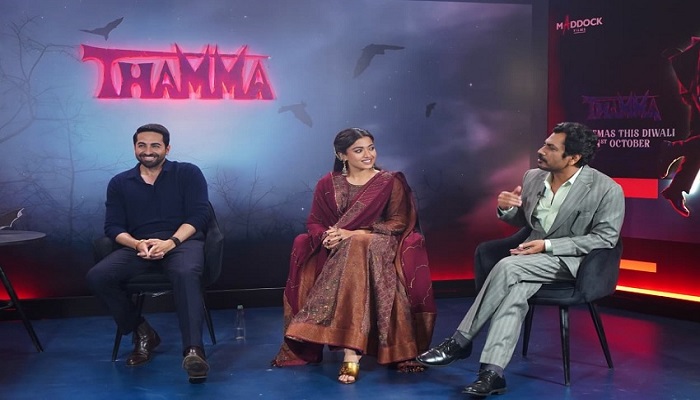 नई दिल्ली/टीम डिजिटल। मैडॉक फिल्म्स की हॉरर-कॉमेडी यूनिवर्स की अगली पेशकश थामा ट्रेलर रिलीज के बाद से ही सुर्खियों में है। आदित्य सरपोतदार द्वारा निर्देशित इस रोमांटिक हॉरर-कॉमेडी फिल्म में आयुष्मान खुराना, रश्मिका मंदाना और नवाजुद्दीन सिद्दीकी लीड रोल में नजर आएंगे। थामा न केवल रोमांस, कॉमेडी और हॉरर का अनूठा मेल है, बल्कि यह स्त्री, मुंज्या, भेड़िया और स्त्री 2 जैसी फिल्मों की कड़ी में अगला बड़ा नाम बनने जा रहा है। यह फिल्म 2025 की सबसे बहुप्रतीक्षित और मनोरंजक फिल्मों में से एक मानी जा रही है। फिल्म के बारे में आयुष्मान खुराना, रश्मिका मंदाना और नवाजुद्दीन सिद्दीकी ने पंजाब केसरी, नवोदय टाइम्स, जगबाणी और हिंद समाचार से खास बातचीत की। पेश हैं मुख्य अंश...