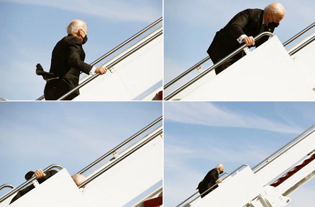 WATCH: Biden falls three times trying to climb the stairs to board Air Force One pic.twitter.com/IfDUjLPQB4