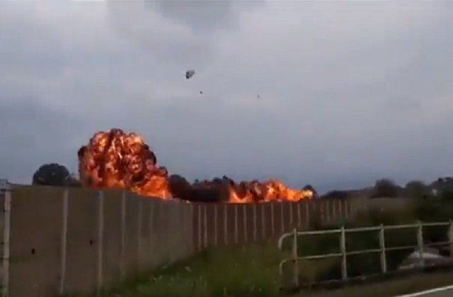 वीडियो में आप देख सकते हैं कि वायुसेना के कई सारे विमान एयर शो के अभ्यास सत्र में बेहद की कम ऊंचाई पर उड़ान भर रहे थे। चार विमानों का एक समूह सबसे आगे उड़ता हुआ आगे बढ़ता है। उसके पीछे भी चार विमान उड़ते हुआ आ रहे हैं। इसी बीच एक विमान बेहद ही कम ऊंचाई पर उड़ते हुए आता है। विमान को देखने पर ऐसा प्रतीत होता है कि पायलट का उस पर नियंत्रण नहीं है। अगले ही पल में विमान जमीन पर गिर जाता है और आग के गोले में तबदील हो जाता है। हालांकि पायलट पैराशूट की मदद से नीचे उतरता हुआ नजर आता है।