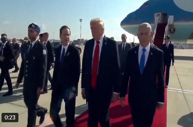 Trump, Netanyahu, and Israeli President Herzog walked side-by-side down the red carpet at Ben Gurion Airport.