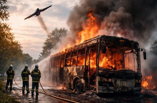 International Desk: यूक्रेन के पाव्लोहराद जिले में शनिवार को रूस ने एक गंभीर ड्रोन हमला किया। रूसी सुसाइड ड्रोन ने खदानों में काम करने वाले मजदूरों को ले जा रही एक सर्विस बस को निशाना बनाया। हमले के बाद बस में भीषण आग लग गई और वह जलकर पूरी तरह क्षतिग्रस्त हो गई। इस हमले में कम से कम 15 लोगों की मौके पर ही मौत हो गई, जबकि 7 अन्य लोग गंभीर रूप से घायल हो गए। घायलों को तुरंत नजदीकी अस्पतालों में भर्ती कराया गया। फायर ब्रिगेड की टीम ने मौके पर पहुंचकर आग पर काबू पाया।