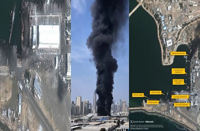 International Desk: ईरान से जंग के चौथे दिन अमेरिका ने ईरान के दो अहम नौसैनिक अड्डों बंदर अब्बास (Bandar Abbas) और कोनार्क Konarak Naval Base पर बड़े हमले कर तबाह कर दिए। टेलाइट इमेज में बंदर अब्बास बेस पर तैनात IRINS Makran में आग और भारी नुकसान दिखाई दे रहा है। यह जहाज पहले एक ऑयल टैंकर था, जिसे “फॉरवर्ड बेस शिप” में बदला गया था और 2021 से ईरानी नौसेना की लंबी दूरी की तैनाती में अहम भूमिका निभा रहा था।