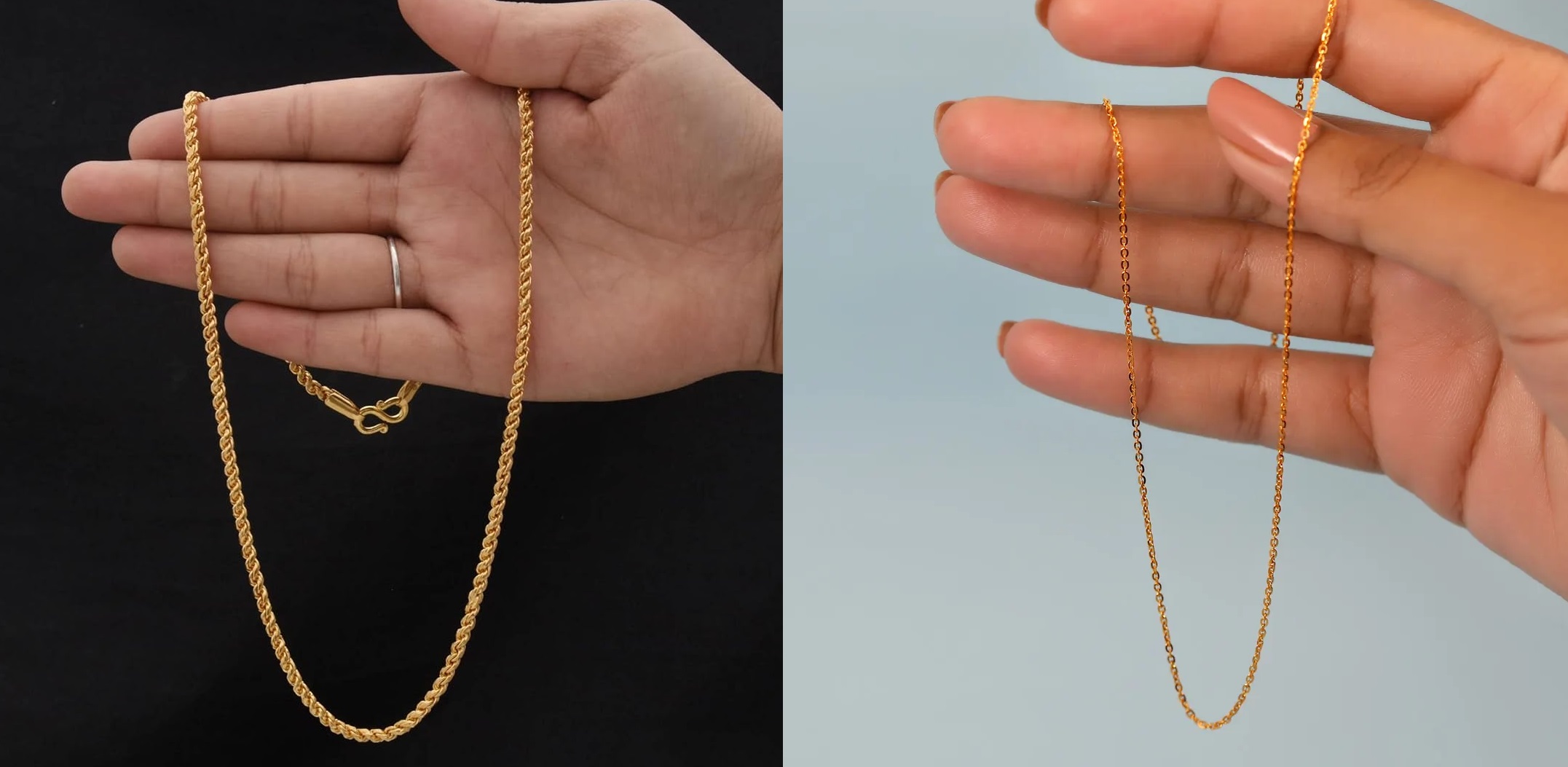 रोजमर्रा पहनावे के लिए: 14 कैरेट चेन ज्यादा टिकाऊ और मजबूत होती है, घिसने या टूटने का डर कम रहता है और खर्च भी कम आता है।