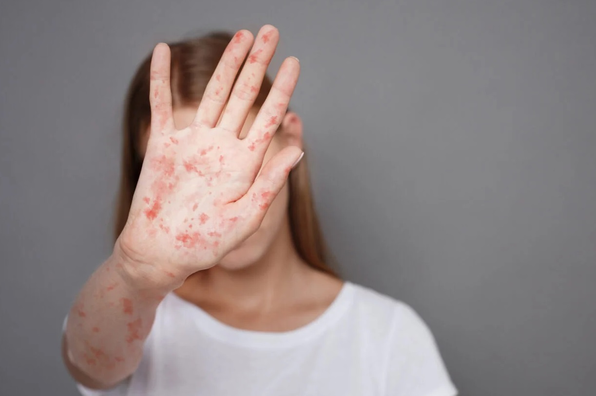 लाल चकत्ते: चेहरे से शुरू होकर पूरे शरीर पर फैलने वाले गहरे लाल दाने।