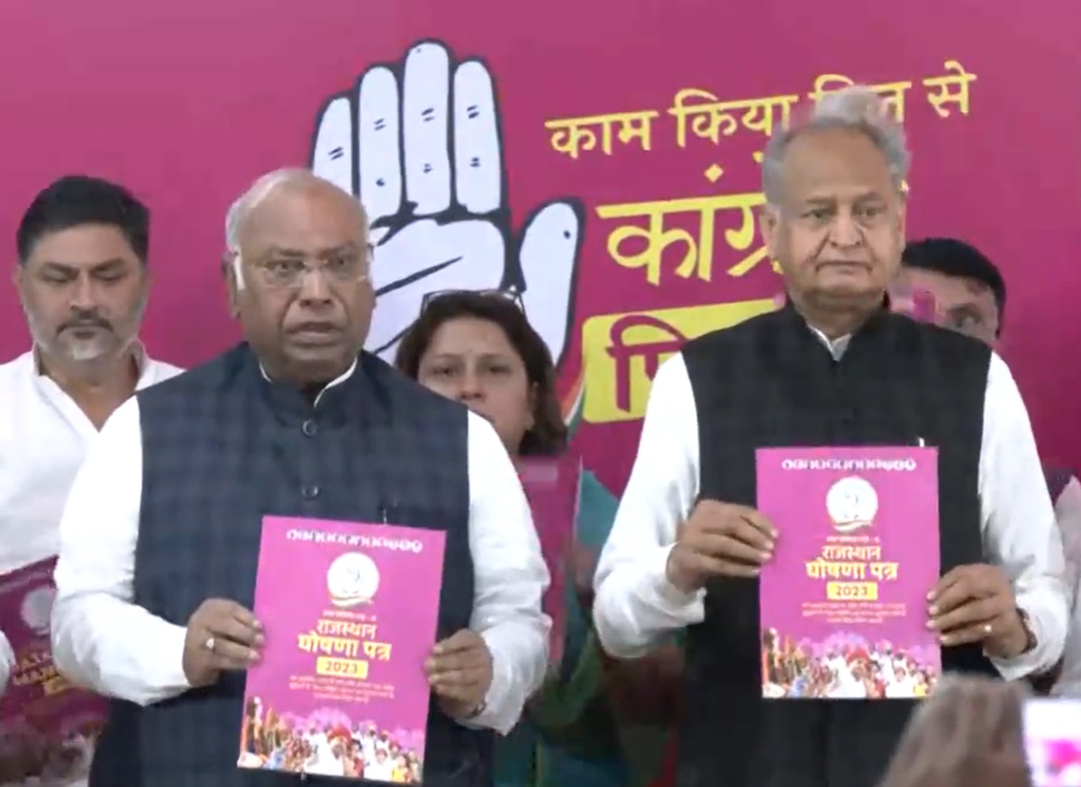 कांग्रेस अध्यक्ष मल्लिकार्जुन खरगे ने मुख्यमंत्री अशोक गहलोत तथा घोषणा पत्र समिति के अध्यक्ष डॉ सीपी जोशी के साथ यहां कांग्रेस मुख्यालय में यह 'जन घोषणा पत्र' जारी किया। इस अवसर पर खरगे ने राजस्थान को कांग्रेस का मजबूत गढ़ बताते हुए कहा ‘‘ हम वही वादे करते हैं जो पूरा कर सकते हैं। पांच साल में हम युवाओं को 10 लाख नौकरियां देंगे। उसमें से चार लाख नौकरियां सरकारी होंगी।'' उन्होंने विश्वास जताया कि इस बार फिर राज्य में कांग्रेस की सरकार आएगी। मुख्यमंत्री अशोक गहलोत ने कहा कि राजस्थान की अर्थव्यवस्था इस साल के अंत तक 15 लाख करोड़ रुपये की हो जाएगी और 2030 तक इसे 30 लाख करोड़ रुपये तक ले जाने का लक्ष्य रखा गया है।