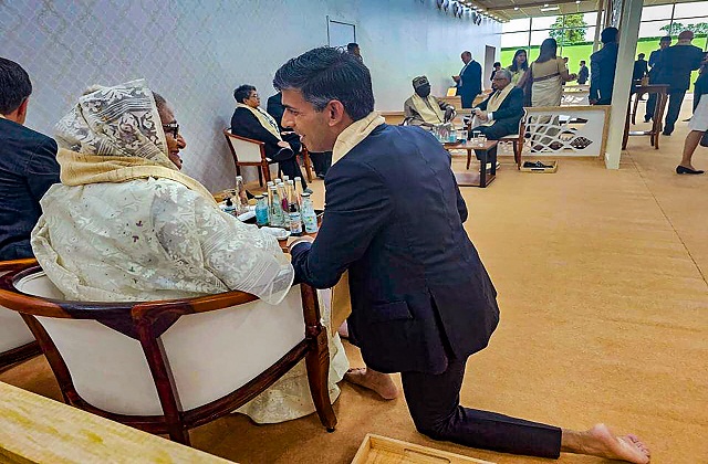 शेख हसीना कुर्सी पर बैठी हुई थीं और ऋषि सुनक उनके पास जाकर जमीन पर घुटनों के बल बैठ गए व बातचीत करने लग गए, इस दौरान सुनक नंगे पैर थे। कई लोगों ने तस्वीर को बेहद प्यारा और आकर्षक बताया। बता दें कि ऋषि सुनक रविवार सुबह पत्नी अक्षता मूर्ति के साथ अक्षरधाम मंदिर पहुंचे और यहां उन्होंने रीति-रिवाज के साथ भगवान स्वामी नारायण के दर्शन किए और विधिविधान से पूजा-अर्चना की। अक्षरधाम मंदिर के निदेशक के मुताबिक, उन्हें देखकर ऐसा नहीं लगा कि कोई राष्ट्राध्यक्ष आया हो। उन्होंने बिल्कुल एक भक्त की तरह पूजा में हिस्सा लिया। ऋषि सुनक जी-20 शिखर सम्मेलन में शामिल होने के लिए भारत पहुंचने पर कहा कहा था कि उन्हें हिंदू होने पर गर्व है।