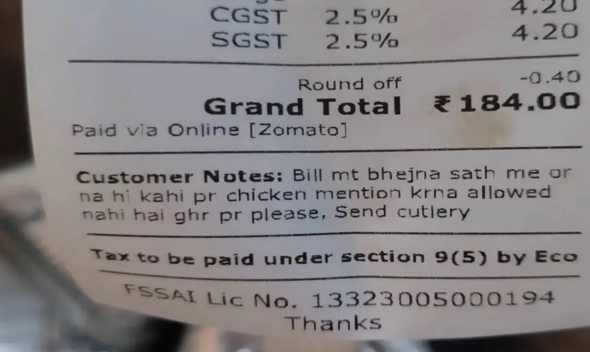 "प्लीज बिल मत भेजना। साथ में कहीं भी 'चिकन' (Chicken) का जिक्र नहीं होना चाहिए क्योंकि घर पर अलाउड नहीं है। प्लीज कटलरी (चम्मच-कांटा) जरूर भेज देना।"
