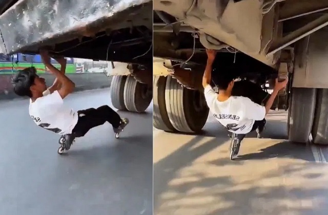 वीडियो में देखा जा सकता है कि सड़क पर एक बस सामान्य रफ्तार से चल रही होती है। तभी पीछे से एक लड़का स्केटिंग करते हुए तेजी से आता है और अचानक वह स्टंट करते हुए सीधे चलती बस के नीचे घुस जाता है। कुछ सेकंड तक स्थिति बेहद खतरनाक लगती है और फिर वह सुरक्षित तरीके से बस के नीचे से निकलकर बाहर आ जाता है।