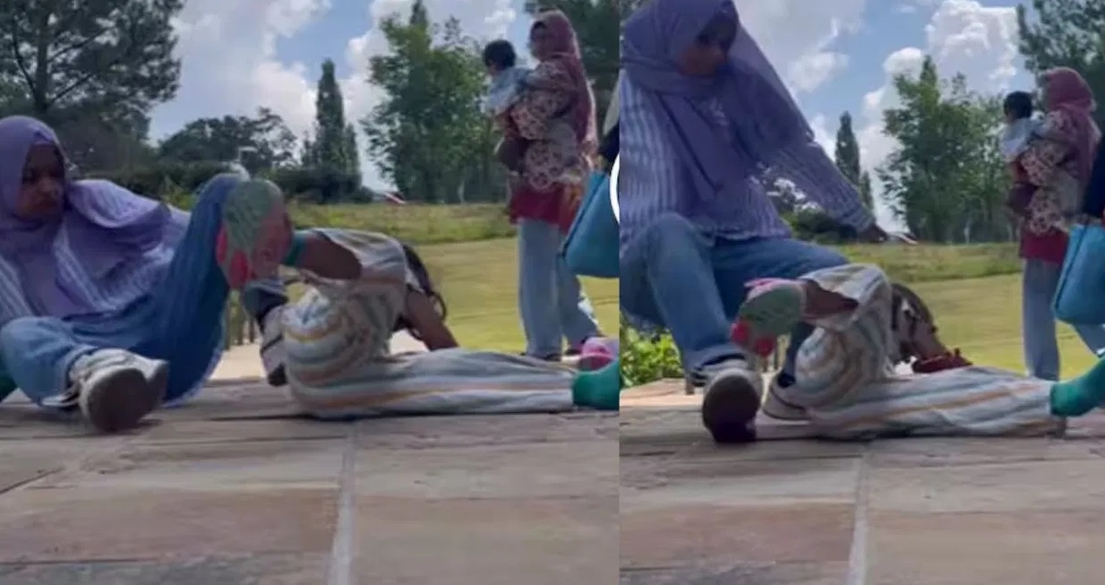 पहला हादसा: लड़की के ठीक पीछे चल रही एक छोटी बच्ची अचानक फिसल जाती है और धीरे से पीछे की ओर गिरकर जमीन पर बैठ जाती है। बच्ची तुरंत रोना शुरू कर देती है।