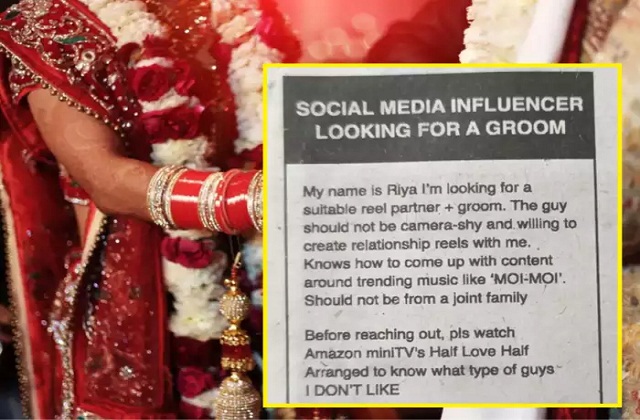 इस विज्ञापन का टाइटल है- सोशल मीडिया इन्फ्लुएंसर को एक दूल्हे की तलाश है। मेरा नाम रिया है। मैं अपने लिए सूटेबल पार्टनर + दूल्हा खोज रही हूं। लड़का कैमरे से घबराता ना हो और मेरे साथ रिलेशनशिप रील्स बनाने की इच्छा रखता हो। साथ ही, उसे पता होना चाहिए कि MOI-MOI जैसे ट्रेंडिंग म्यूजिक पर कॉन्टेंट कैसे बनाना है। वह ज्वाइंट फैमिली नहीं होना चाहिए। कृप्या मुझसे संपर्क करने से पहले 'अमेजन मिनी टीवी' पर 'हाफ लव हाफ अरेंज्ड' देख लीजिए, इससे आप जान जाएं कि मुझे किस तरह के लड़के नहीं पंसद हैं। और हां, लड़के को प्रीमियर प्रो की जानकारी होनी चाहिए ताकि वह मेरी Reels/Vlogs एडिट कर सके।
