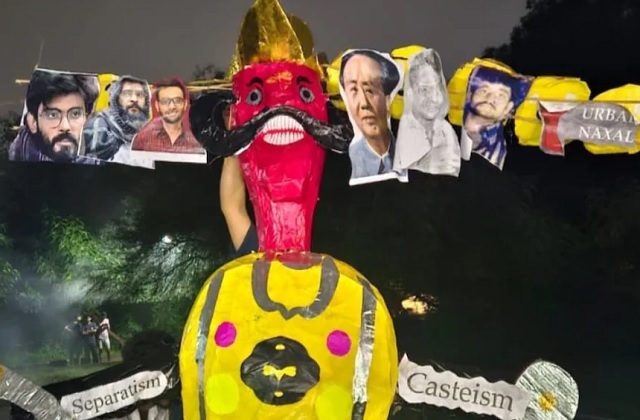 कार्यक्रम का विवाद तब और बढ़ गया जब रावण के 10 सिरों पर दिल्ली दंगों की साजिश में आरोपी उमर खालिद और शरजील इमाम सहित कई लोगों की तस्वीरें लगाई गईं। इसके अलावा पुतले पर उन लोगों के चेहरे भी लगाए गए, जिन्हें ABVP ने “राष्ट्रविरोधी विचारधारा” का प्रतीक बताया।