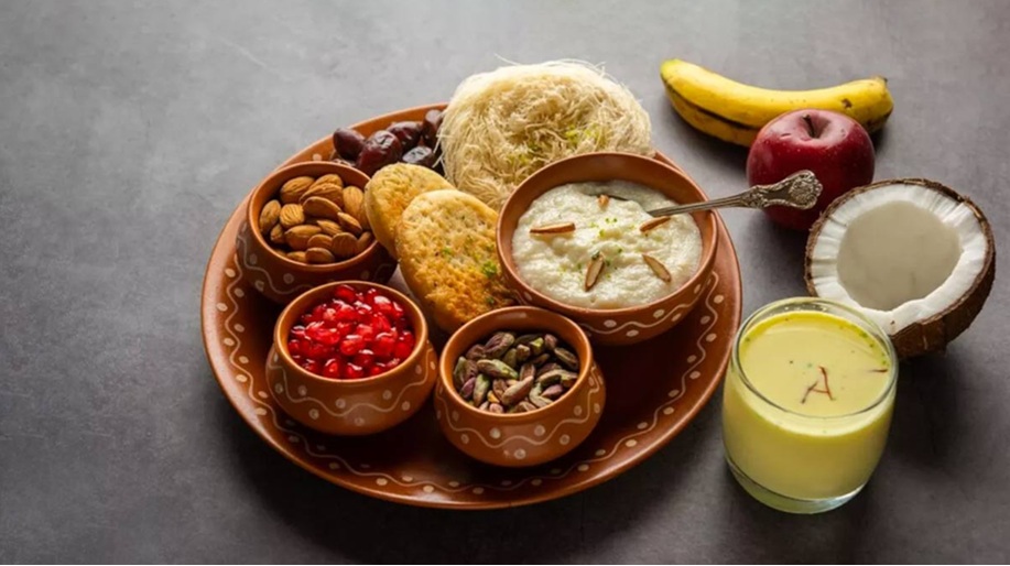 खीर, ड्राई फ्रूट्स (मेवे),फल (फ्रूट्स),मिठाई,नारियल पानी,दूध, हलवा, परांठा, सूत फेनी (सेवई आधारित मिठाई),चाय, मठरी (नमकीन)