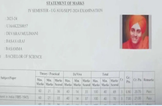 नेशनल डेस्क : विजयनगर श्री कृष्णदेवराय विश्वविद्यालय (Vijayanagara Sri Krishnadevaraya University) के कोप्पल स्थित गविसिद्धेश्वर कला, कॉमर्स और साइंस विभाग में एक चौंकाने वाली लापरवाही सामने आई है। यहां देवराज मूलीमनी नामक छात्र की मार्कशीट में उसकी फोटो की जगह किसी स्वामीजी की फोटो लग गई। छात्र ने मार्कशीट देखकर हंगामा मचा दिया और मामला सोशल मीडिया पर तेजी से वायरल हो गया।