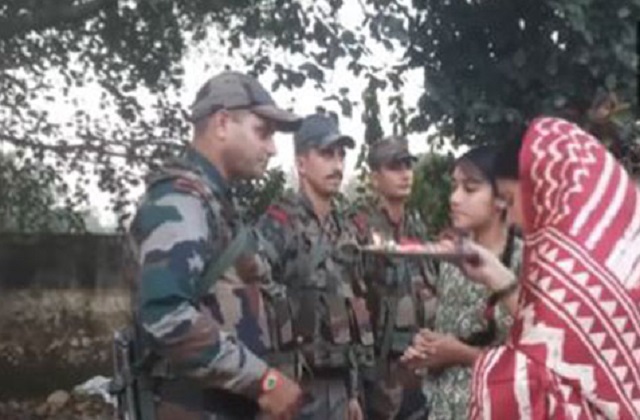 नेशनल डेस्क: देश में आज रक्षाबंधन त्योहार मनाया जा रहा है। यह त्योहार भारतीय संस्कृति का पवित्र प्रतिबिंब है। रक्षा बंधन पर अपनी बहनों से दूर बैठे सीमा पर तैनात सुरक्षाकर्मियों को भी भाई-बहन के प्यार का तोहफा मिला। स्थानीय स्कूली छात्राओं ने देशवासियों की सुरक्षा सुनिश्चित करने के लिए दिन रात बॉर्डर पर जुटे सैनिकों की सेवाओं के प्रति आभार व्यक्त करने के लिए उनके हाथों पर राखी बांधी। जम्मू-कश्मीर के अखनूर सेक्टर में स्कूली छात्राओं ने सेना के जवानों के हाथों पर राखी बांधी। इनकी कुछ तस्वीरें भी सामने आईं है, जिनमें स्कूली छात्राएं जवानों के माथे पर तिलक लगाते और उनके लिए प्रार्थना करने हुए देखा गया।