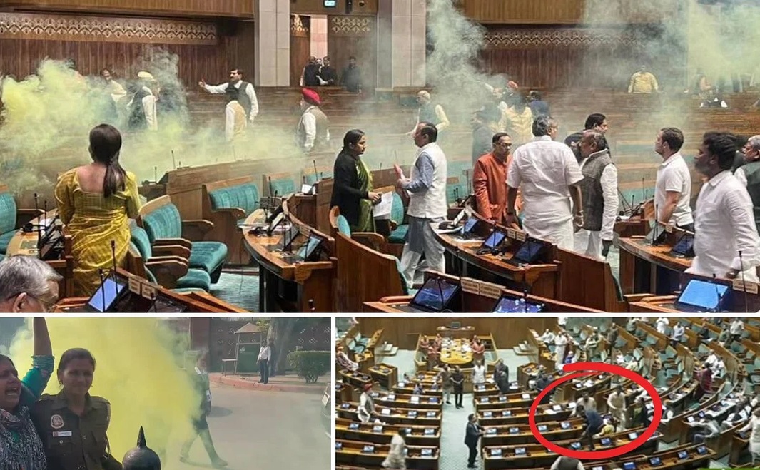 सूत्रों ने बताया कि विशाल को गुरुग्राम से हिरासत में लिया गया है, जबकि ललित को पकड़ने के लिए दिल्ली पुलिस के दलों को विभिन्न स्थानों पर भेजा गया है। सागर शर्मा और मनोरंजन डी शून्यकाल के दौरान दर्शक दीर्घा से लोकसभा में कूद गए और उन्होंने 'केन' से पीली गैस को फैलाते हुए नारेबाज़ी की। हालांकि सांसदों ने उन्हें पकड़ लिया। लगभग उसी समय संसद भवन के बाहर अमोल शिंदे और नीलम ने केन से लाल और पीले रंग का धुआं फैलाते हुए "तानाशाही नहीं चलेगी" आदि नारे लगाए।