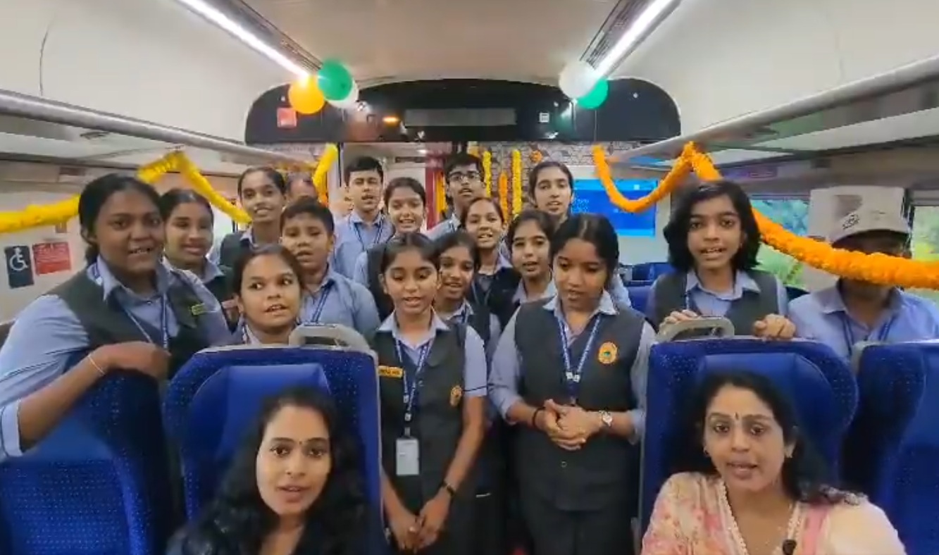 The students of Saraswathi Vidyalaya beautifully performed their school song during the inaugural run of the Ernakulam–Bengaluru Vande Bharat Express pic.twitter.com/uvauXy9e6k