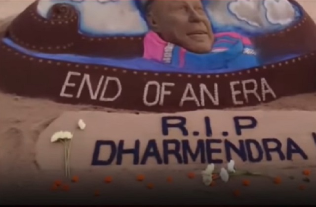 पुरी तट पर रेत कलाकार सुदर्शन ने अभिनेता धर्मेंद्र को दी भावभीनी श्रद्धांजलि