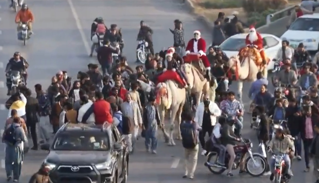 इस्लामाबाद में हाल ही में क्रिसमस समारोहों के दौरान सांता क्लॉज़ की पोशाक पहने ईसाई भक्तों ने ऊंटों पर सवार होकर जश्न मनाया और रैलियाँ निकालीं, जो पाकिस्तान में छुट्टियों के मौसम का एक हिस्सा है, लेकिन यह पारंपरिक सांता क्लॉज़ की छवि नहीं है, बल्कि स्थानीय संस्कृति और परंपरा के साथ क्रिसमस का एक अनूठा उत्सव है.
