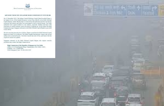 International Desk: सिंगापुर के उच्चायोग ने दिल्ली और राष्ट्रीय राजधानी क्षेत्र (NCR) में वायु गुणवत्ता के ‘सीवियर प्लस’ स्तर पर पहुंचने के बाद अपने नागरिकों के लिए स्वास्थ्य और सुरक्षा एडवाइजरी जारी की है। यह चेतावनी ऐसे समय आई है जब भारतीय अधिकारियों ने प्रदूषण से निपटने के लिए GRAP स्टेज-4 के तहत सबसे सख्त पाबंदियां लागू कर दी हैं। सिंगापुर हाई कमीशन ने कहा कि दिल्ली-NCR में रह रहे सिंगापुर नागरिक स्थानीय स्वास्थ्य सलाहों और प्रदूषण संबंधी प्रतिबंधों का सख्ती से पालन करें। यह एडवाइजरी 13 दिसंबर को कमीशन फॉर एयर क्वालिटी मैनेजमेंट (CAQM) द्वारा GRAP स्टेज-4 लागू किए जाने के बाद जारी की गई।