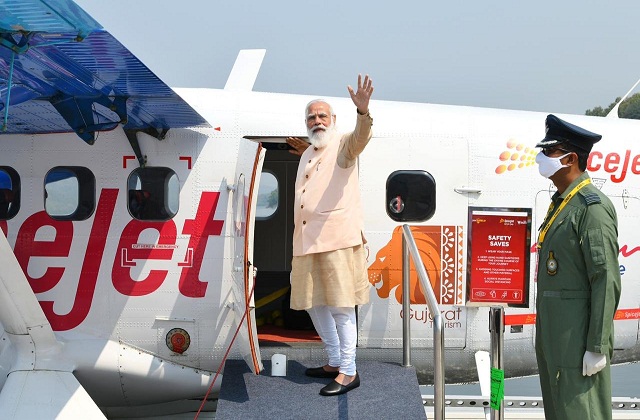 मोदी ने इससे पहले, केवडिया में ‘स्टैच्यू ऑफ यूनिटी' के नजदीक निर्मित जलीय हवाई अड्डे (वॉटर ऐरोड्रोम) का उद्घाटन किया और केवडि़या से अहमदाबाद में साबरती रिवरफ्रंट तक सीप्लेन में पहली उड़ान भरी। यह विमान 40 मिनट में 200 किलोमीटर का सफर तय करने के बाद अहमदाबाद में साबरमती रिवरफ्रंट में उतरा। इससे पहले, एकता दिवस समारोह को संबोधित करते हुए मोदी ने कहा, ‘‘आज सरदार सरोवर से साबरमती रिवर फ्रंट तक सी-प्लेन सेवा का भी शुभारंभ होने जा रहा है। ये देश की पहली और अपने आप में अनूठी सी-प्लेनसेवा है।''