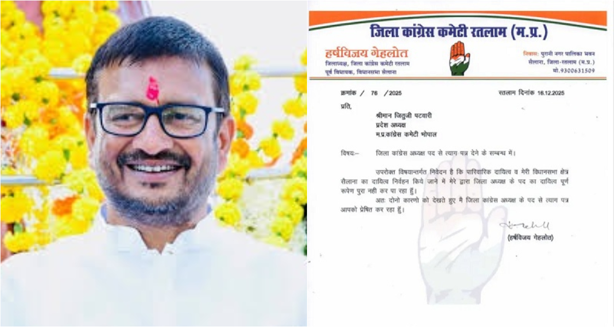 नेशनल डेस्क : मध्य प्रदेश कांग्रेस में ब्लॉक अध्यक्षों की नियुक्तियों की प्रक्रिया चल रही है, लेकिन रतलाम जिले से पार्टी को बड़ा झटका लगा है। यहां के पूर्व विधायक और वर्तमान जिला अध्यक्ष हर्षविजय गेहलोत ने कांग्रेस पार्टी से इस्तीफा दे दिया है।