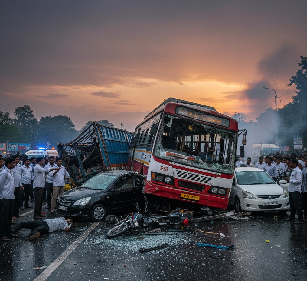 नेशनल डेस्क। करनाल जिले के घरौंडा में नेशनल हाइवे-44 (NH-44) पर आज सुबह एक दिल दहला देने वाला सड़क हादसा हो गया। एक अनियंत्रित ट्रक जो रॉन्ग साइड से आ रहा था उसने एक पंजाब रोडवेज की बस, एक कार और दो बाइकों को जोरदार टक्कर मार दी। हादसा इतना खौफनाक था कि मौके पर मौजूद राहगीरों के रोंगटे खड़े हो गए। इस भीषण हादसे में तीन लोगों की मौके पर ही मौत हो गई जबकि कई लोग गंभीर रूप से घायल हुए हैं।