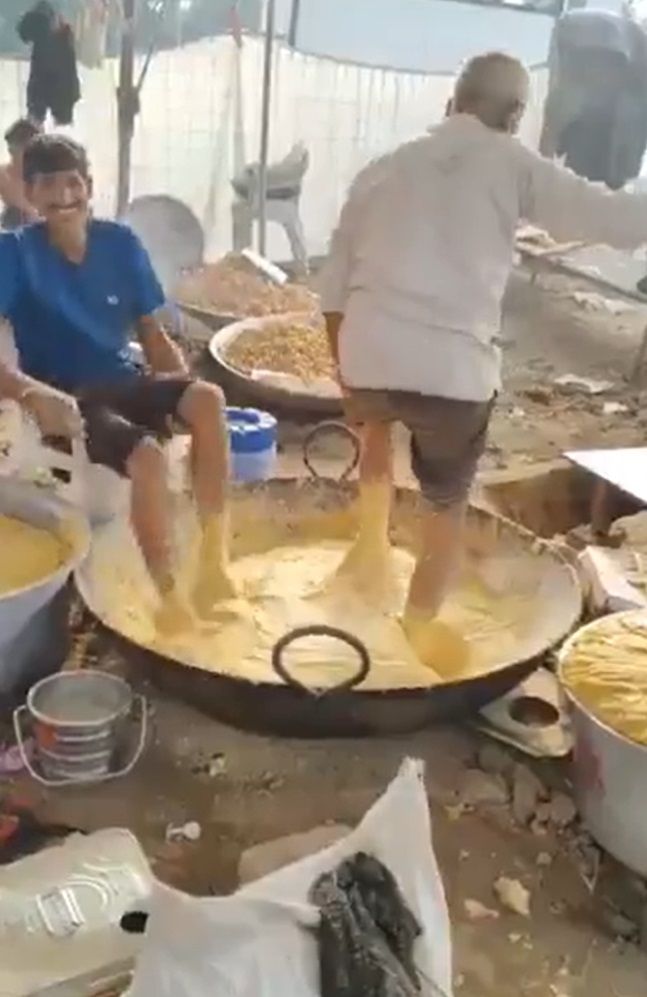 वीडियो में मुख्य रूप से दो दृश्य हैं जो लोगों को चौंका रहे हैं। वीडियो में एक कारीगर एक बड़े से लोहे के कढ़ाह में पूड़ी का आटा गूंथ रहा है। वह आराम से कुर्सी पर बैठा है और उसके दोनों पैर आटे में डूबे हुए हैं जिनसे वह लगातार आटा मसल रहा है। एक दूसरा व्यक्ति भी उसी कढ़ाह के अंदर पैर रखकर आटा गूंथता दिखता है। यह दृश्य दिखाता है कि इतनी बड़ी मात्रा का आटा हाथों से गूंथना कितना मुश्किल होता है लेकिन सफाई के इस तरीके ने लोगों को चिंतित कर दिया है।