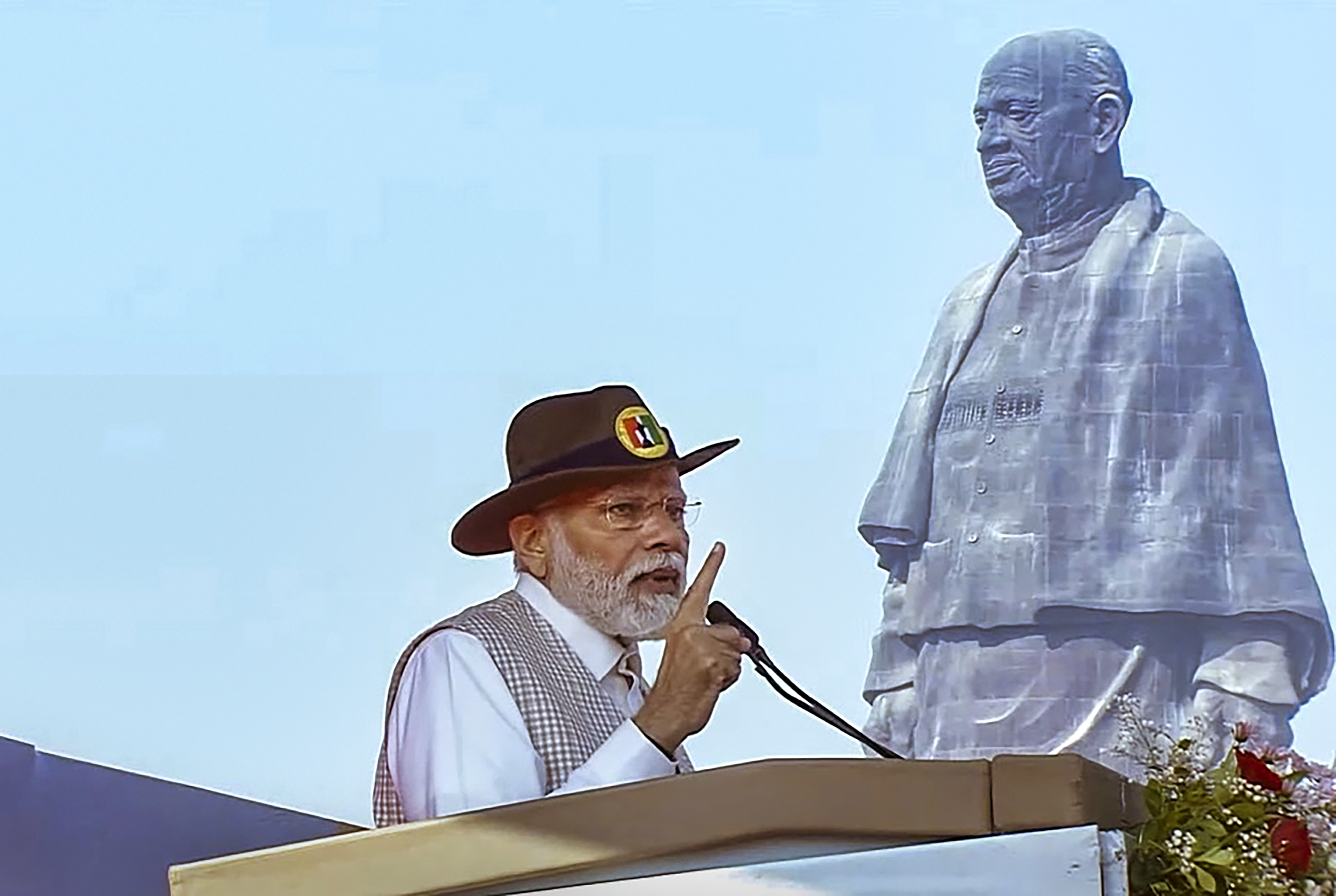 गुजरात के एकता नगर में राष्ट्रीय एकता दिवस परेड में पीएम मोदी ने कहा, "भारत ने अपने नौसैनिक ध्वज से गुलामी के प्रतीक को हटा दिया है। गुलामी के दौर में बने अनावश्यक कानूनों को भी हटाया जा रहा है। आईपीसी की जगह भारतीय न्याय संहिता (बीएनएस) ने ले ली है।" जहां इंडिया गेट पर कभी विदेशी ताकत के प्रतिनिधि की मूर्ति थी, वहां अब नेताजी सुभाष की मूर्ति हमें प्रेरणा दे रही है...किसने सोचा था कि जम्मू-कश्मीर से धारा 370 हट जाएगी? आज कश्मीर आतंकवाद से मुक्त है। भारत और कश्मीर के बीच धारा 370 की दीवार हटा दी गई है और कश्मीर के लोग आतंकवाद के साये से बाहर आ गए हैं।"